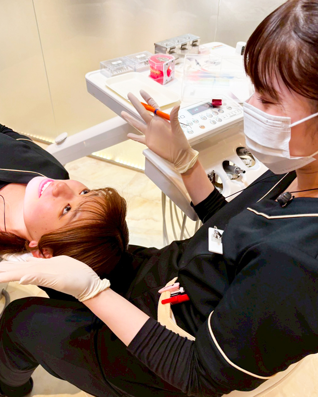 先輩のお口をクリーニングに並行して手技のチェックもしていただきました。